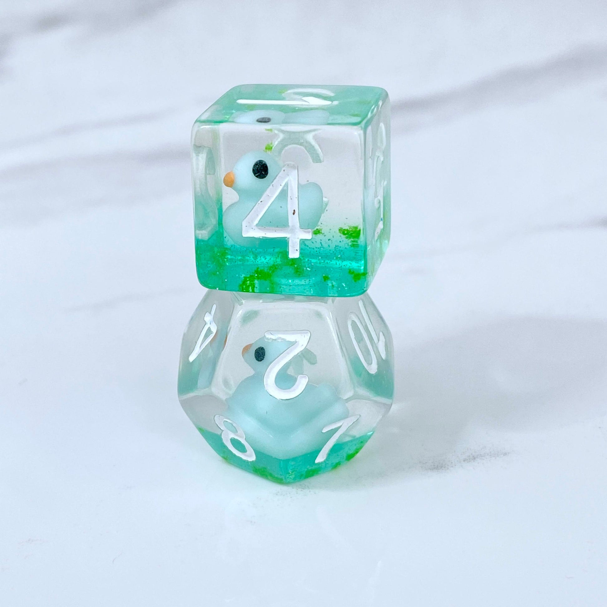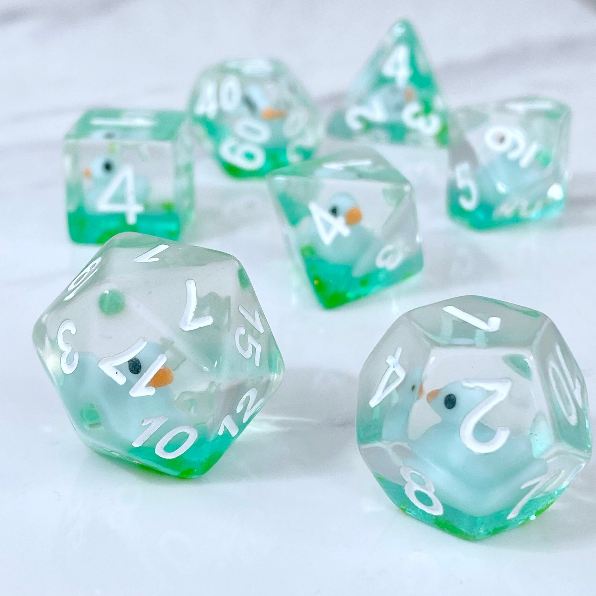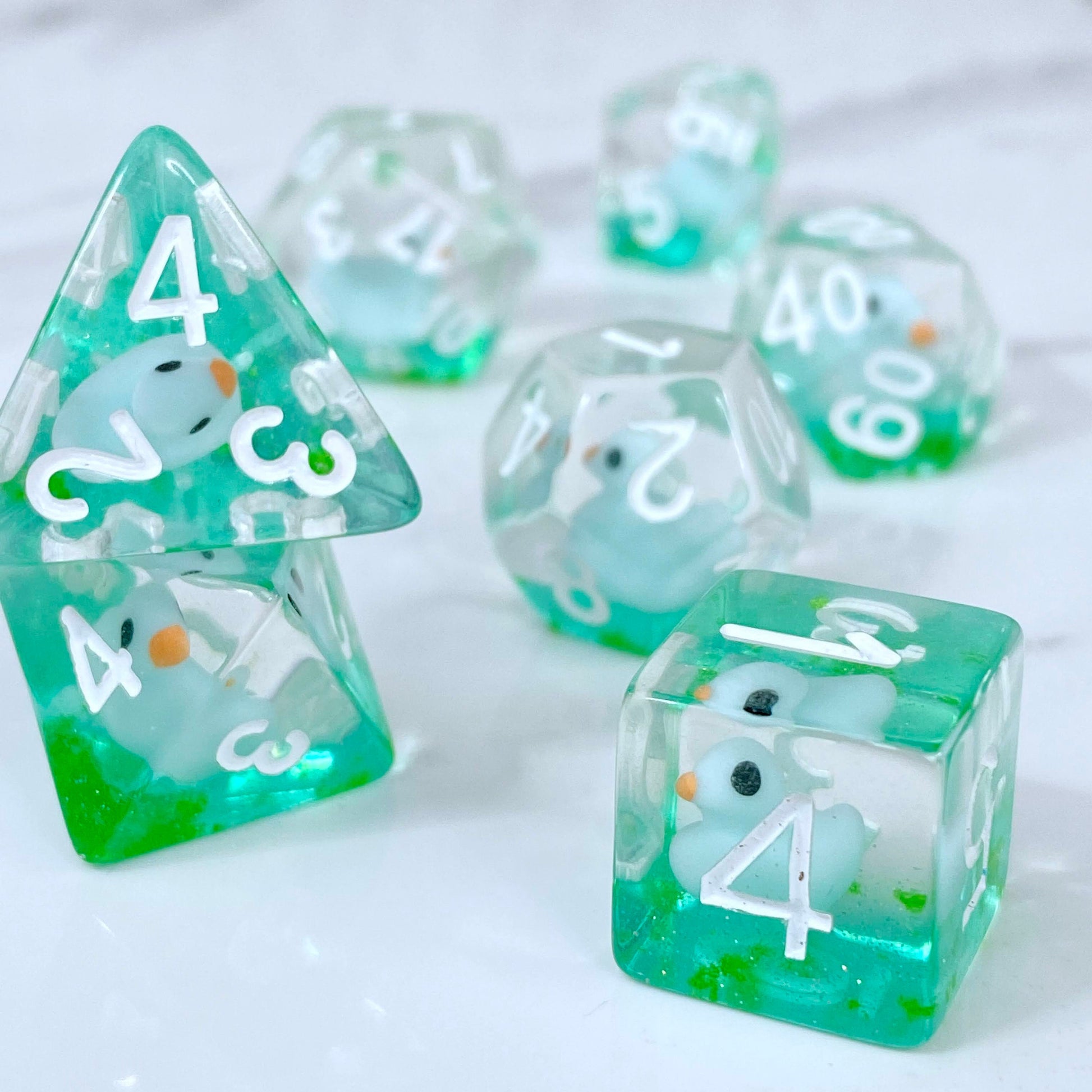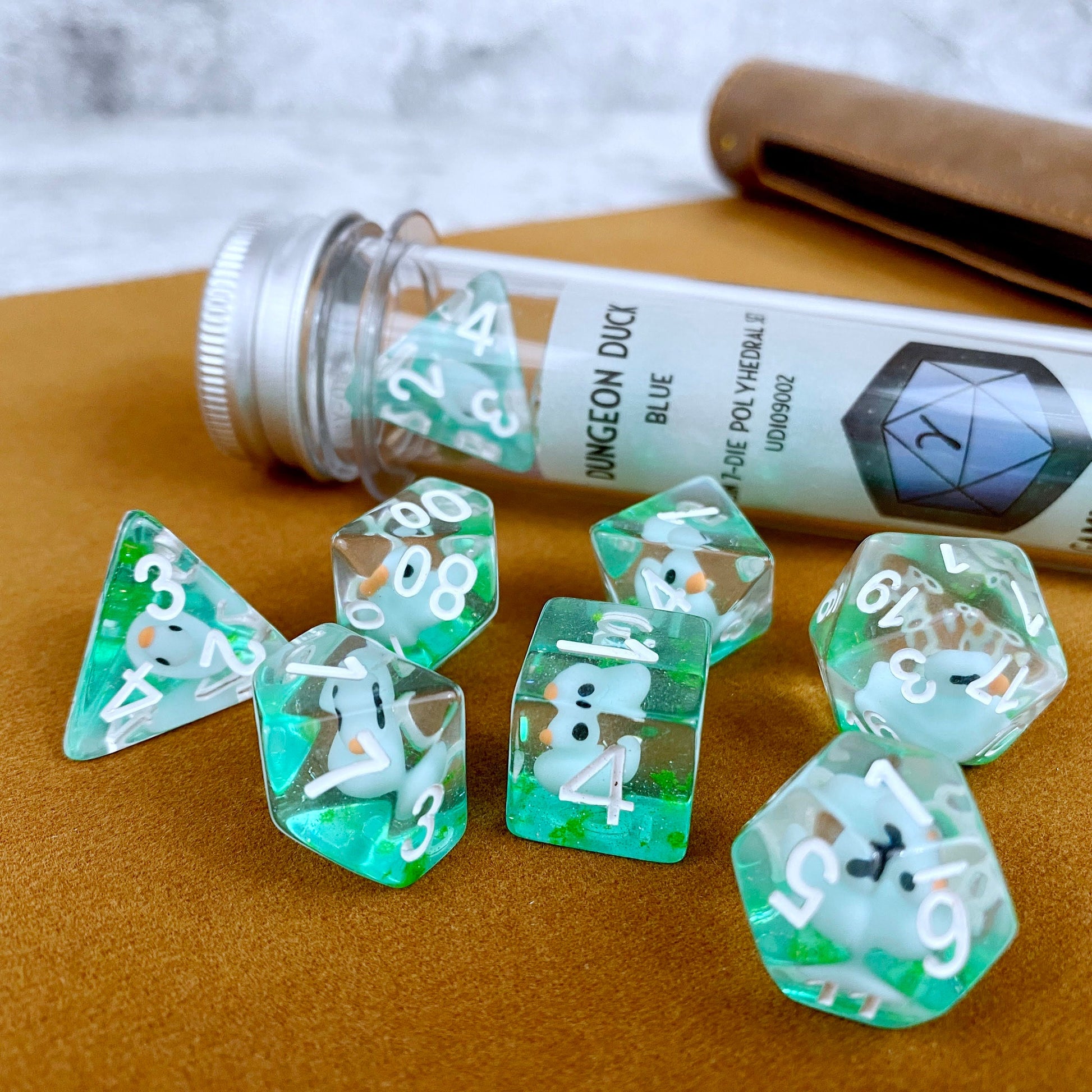 These ducks are ready to dive into the next dungeon with you. All 7 dice have a little rubber ducky style duck. It’s up to you if you to make them lucky or if you should never pick up a duck in a dungeon.