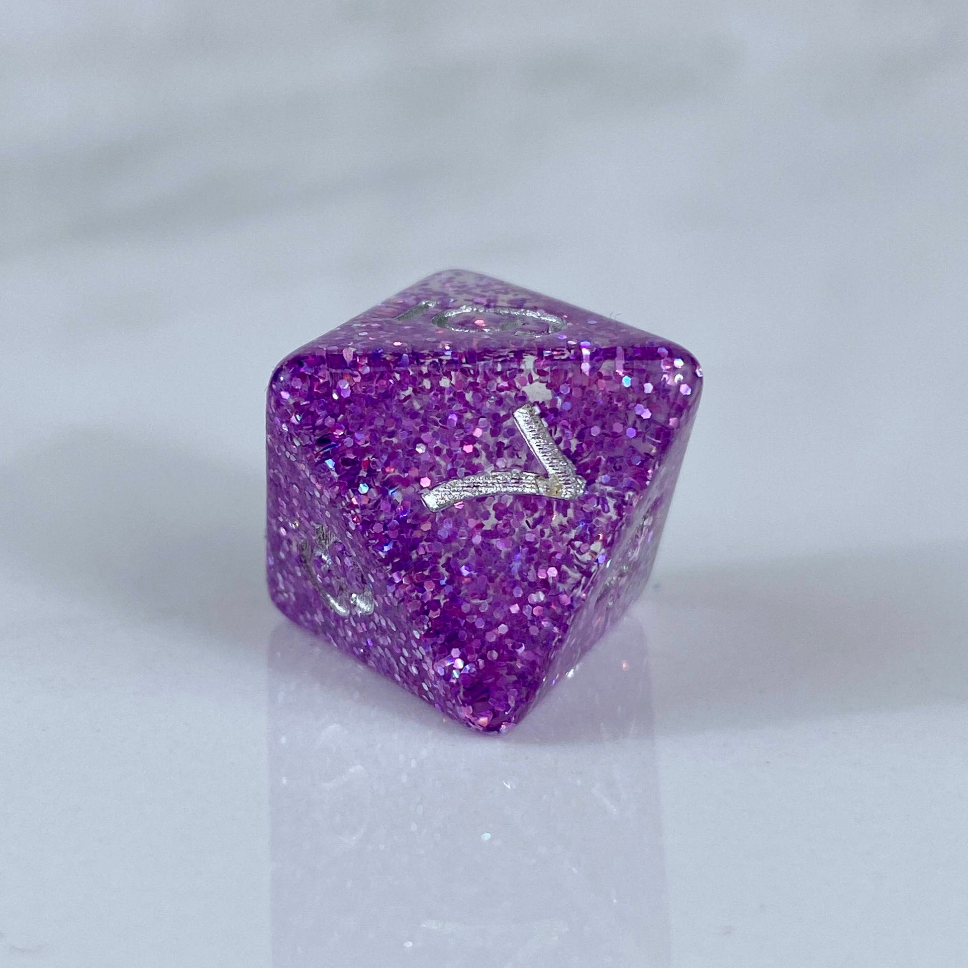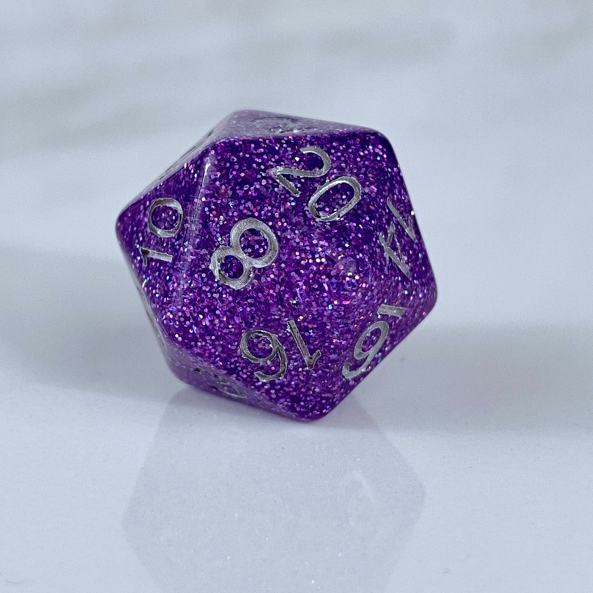 Purple small glitter packed into clear resin, with a small amount of silver glitter mixed in, with silver numbering.