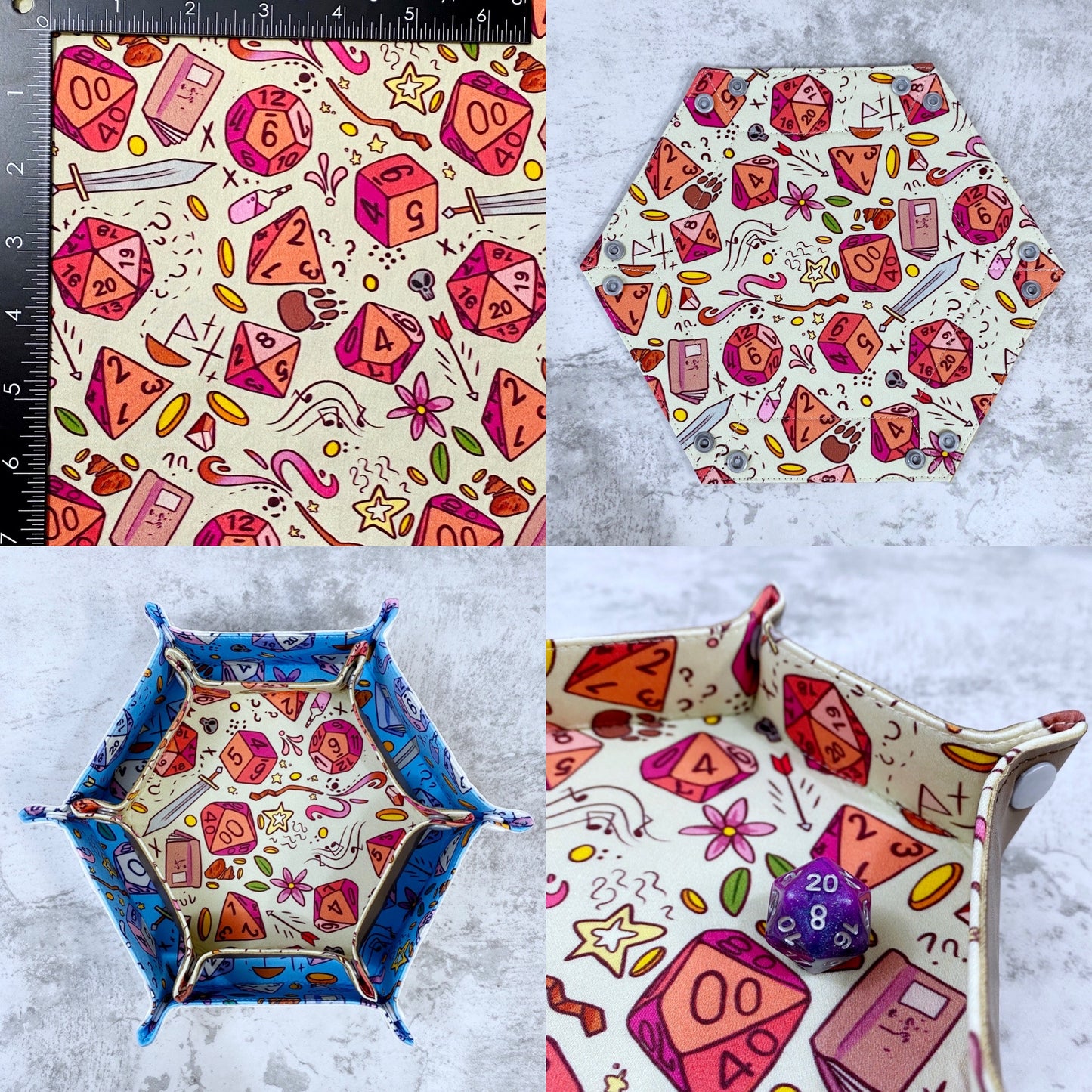 Ready to travel to your next game. Our hex dice trays pop up in a snap (or 6) ready to keep your dice rolls from escaping or game pieces close at hand. They also are perfect for catching your jewelry, keys, or phone.
