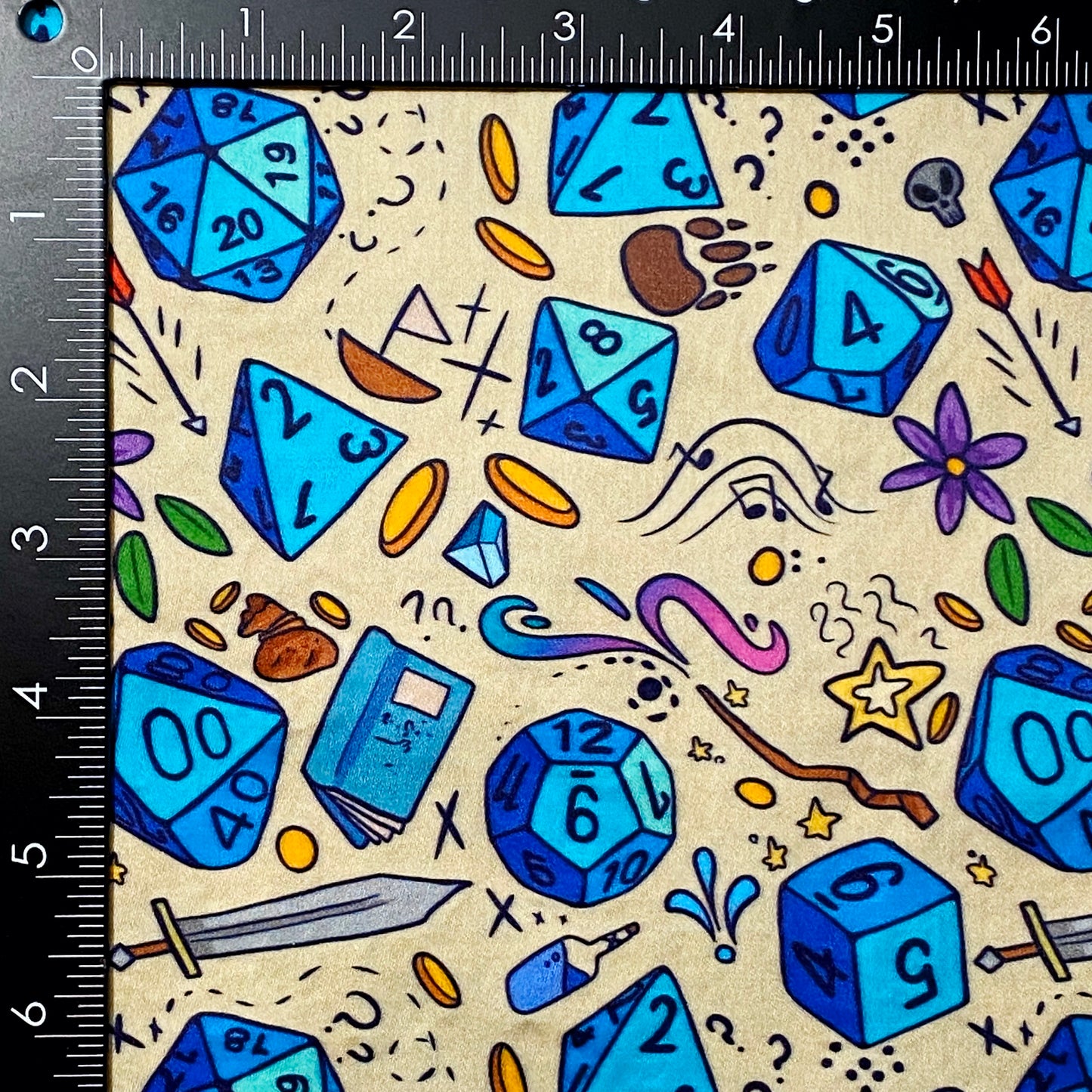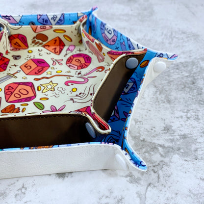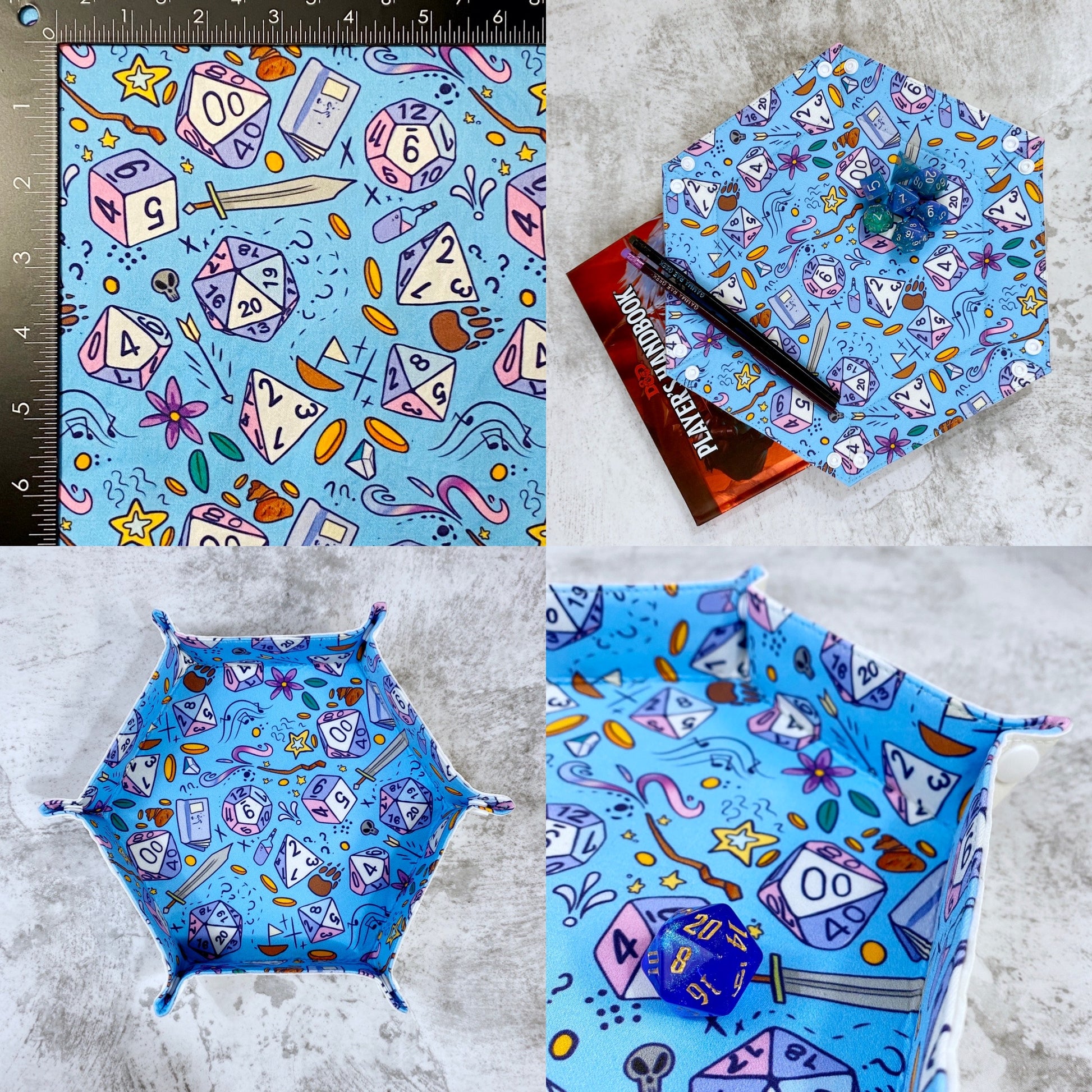 Trays are made with a custom printed organic cotton rolling surface, a thick felt inner layer that cushions tables from metal dice or protects delicate gemstone dice, and is backed with a faux-leather fabric.
