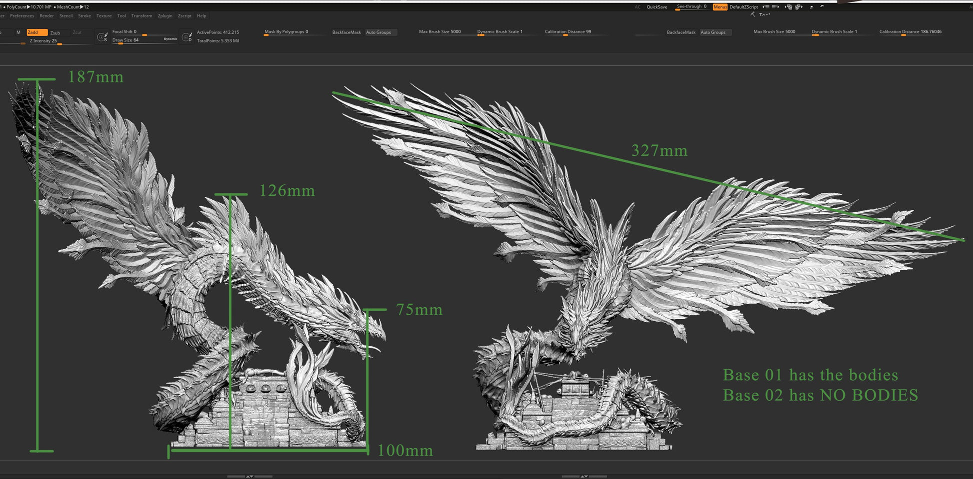 The Seduced Kukulcan with Wings, includes a 100mm temple base and is approximately 187mm tall and 1327mm wingspan. It is shipped as a kit in pieces and will need to be assembled into the final miniature.