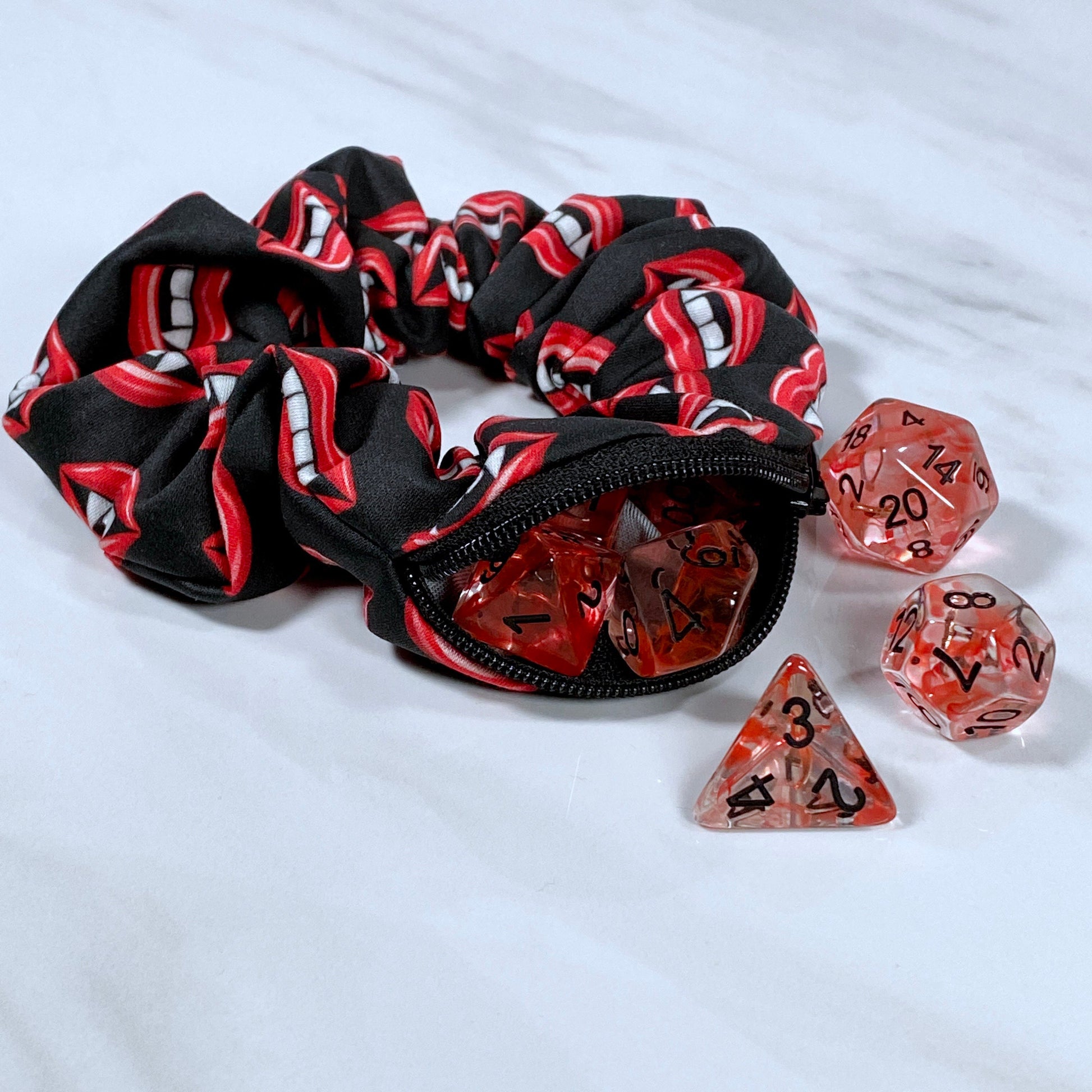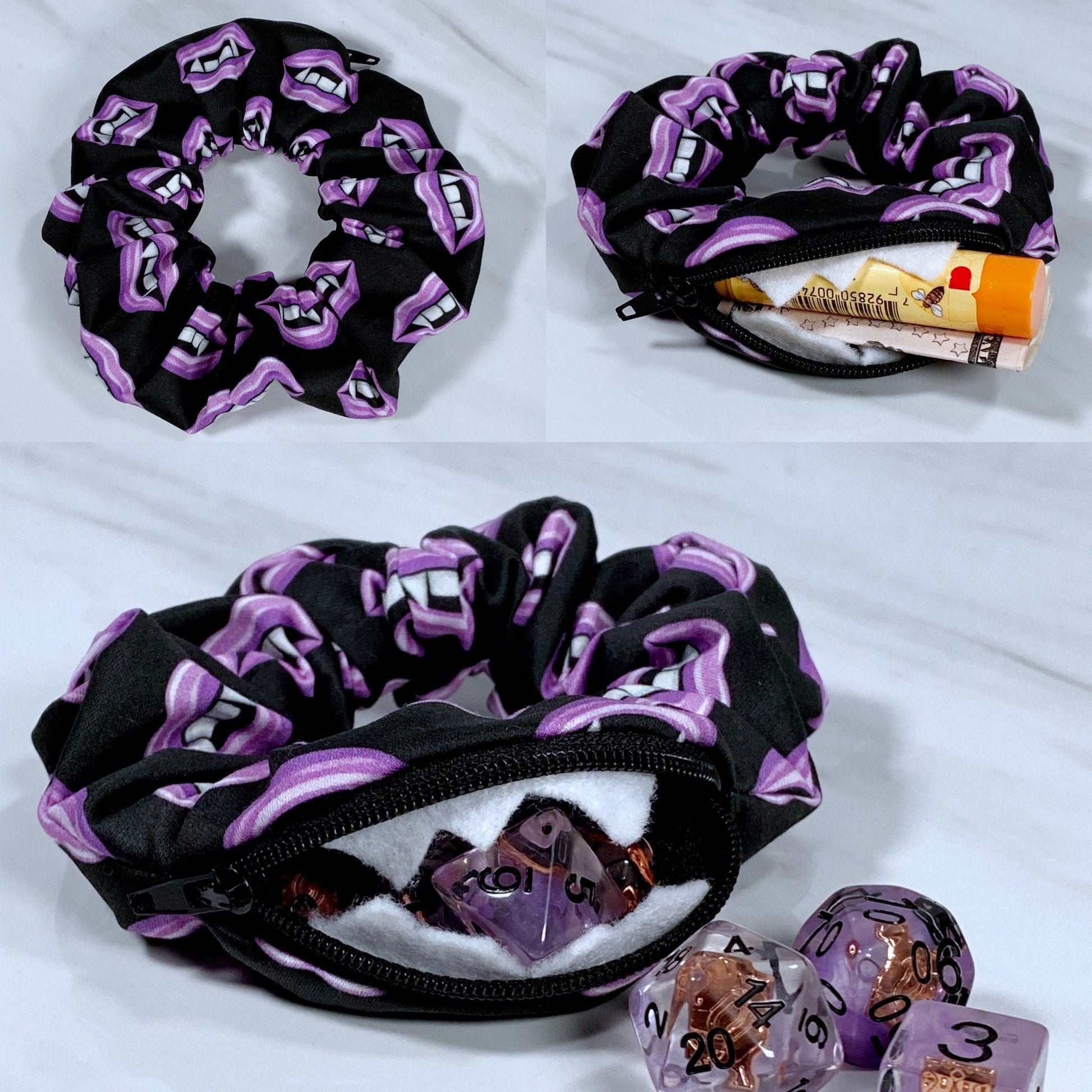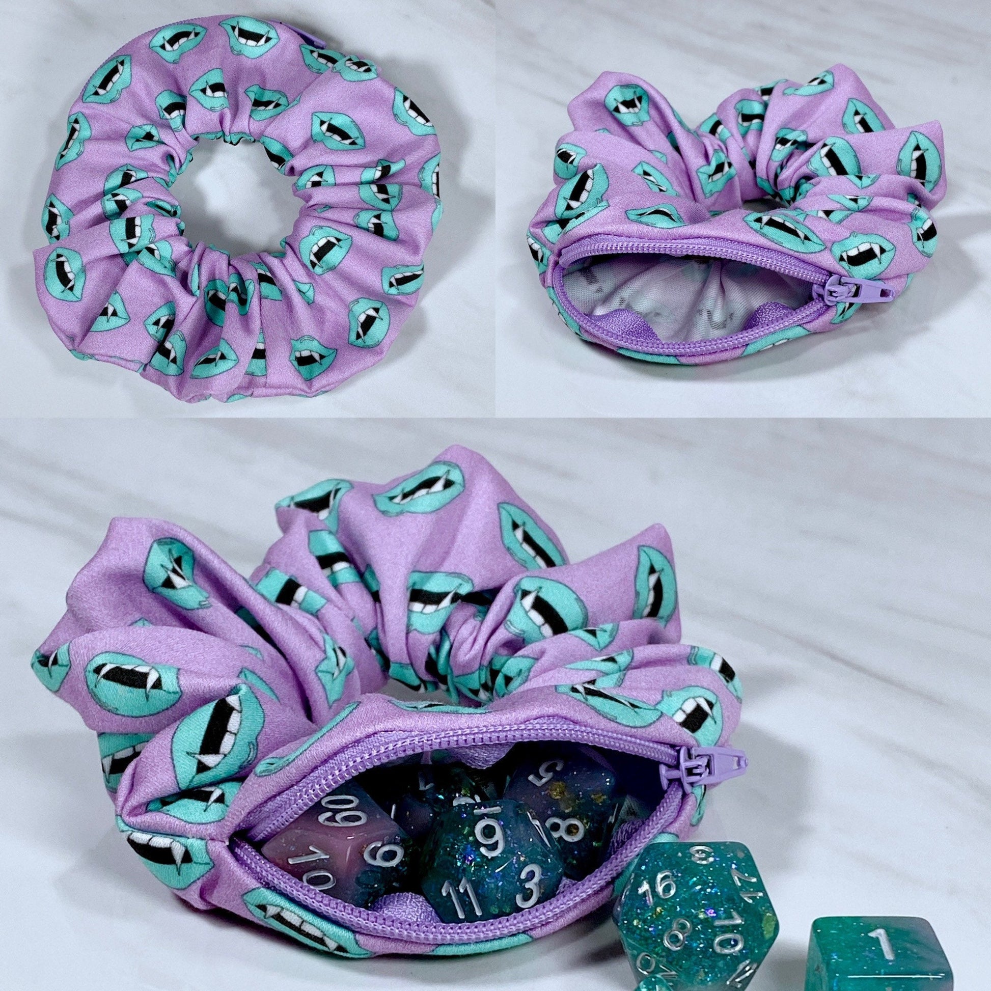 Our zipper scrunchies (or stachies), unzip to reveal the mimics they truly are. Ready to carry a full set of dice, some spare keys, cash, or lip balm. They are sized to be comfortably snug on your wrist, or wrap around your hair 2+ times.