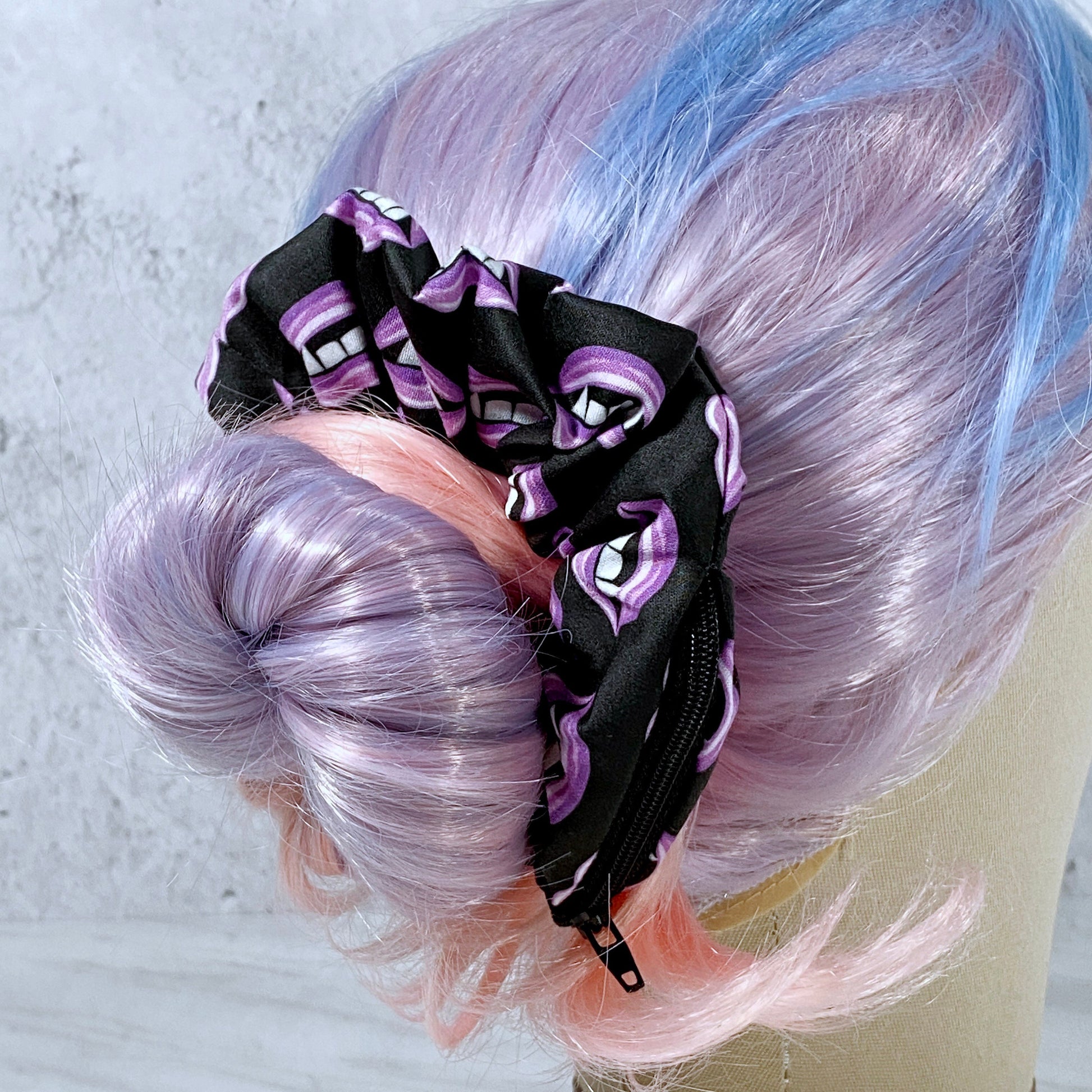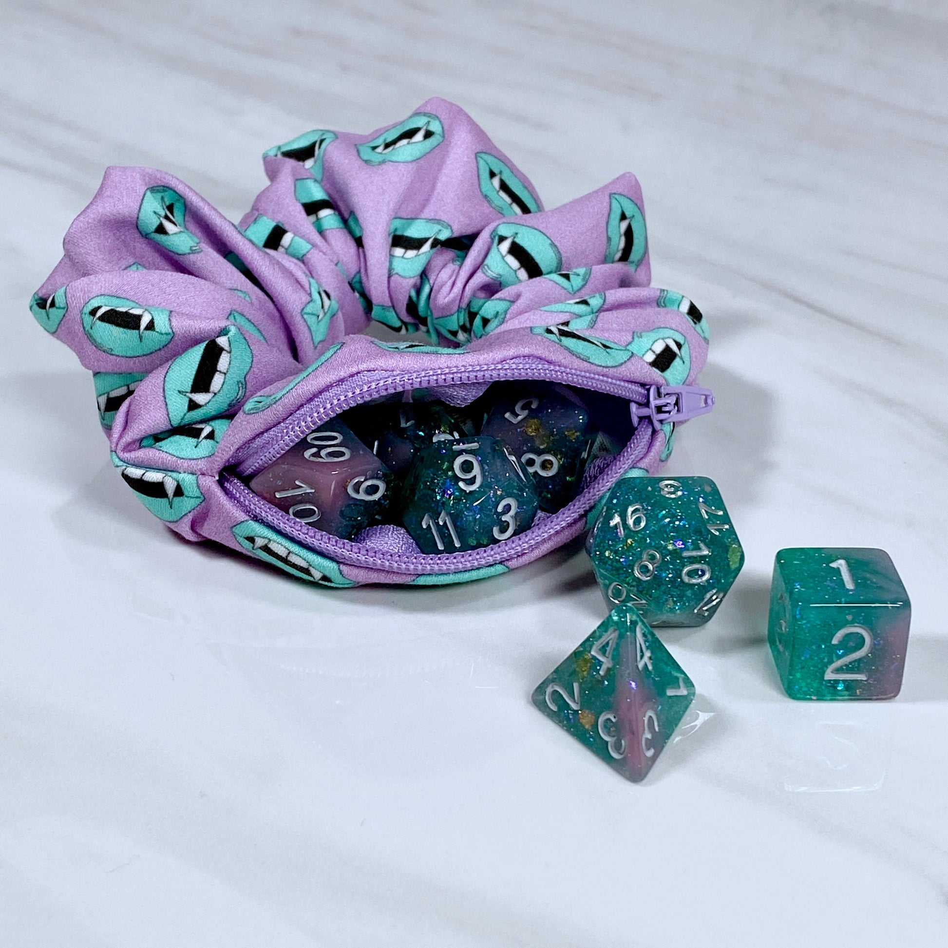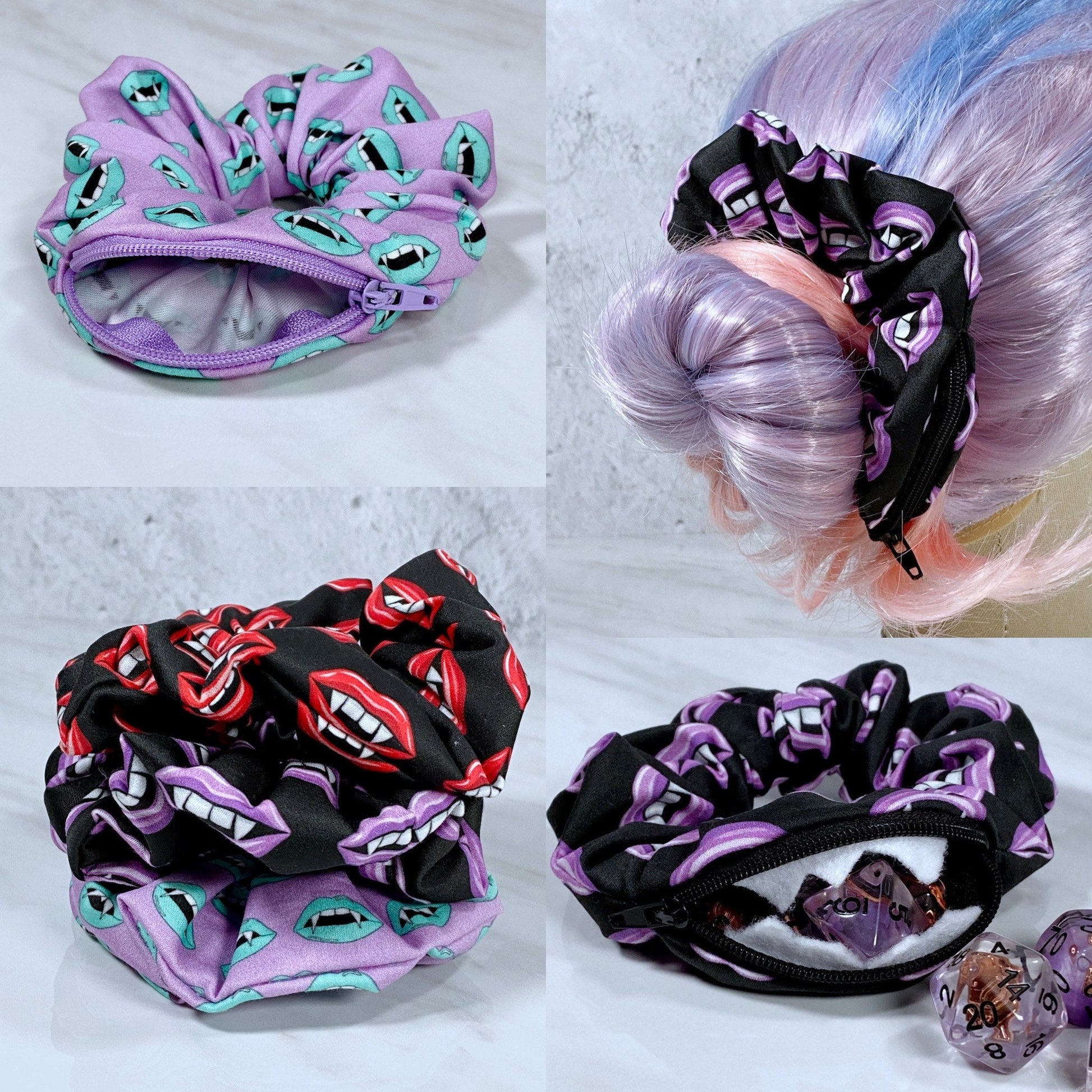 Our zipper scrunchies (or stachies), unzip to reveal the mimics they truly are. Ready to carry a full set of dice, some spare keys, cash, or lip balm. They are sized to be comfortably snug on your wrist, or wrap around your hair 2+ times.